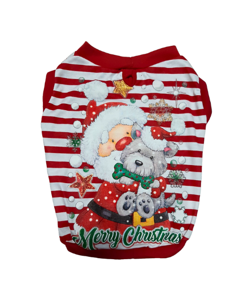 La Camiseta Navideña de Rayas Rojas es perfecta para llevar el espíritu navideño a tu mascota. Con un diseño alegre de rayas rojas, esta camiseta no solo es cómoda sino también estilosa, ideal para cualquier evento navideño.