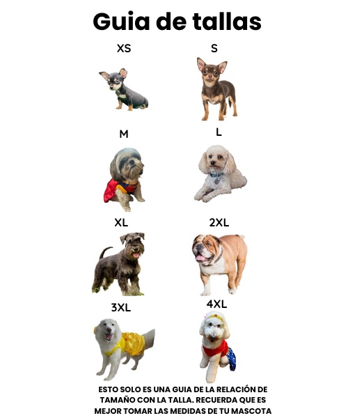 Recomendación: Toma las medidas de tu mascota según esta tabla, ya que nuestras tallas pueden diferir de otras tiendas.